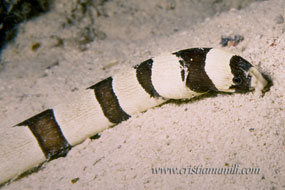 Se invece ci dirigiamo a sud, qui il fondale tende a scendere più rapidamente da quando usciamo dalla baia fino a portarci fino a 30-35m, oltre a grossi ventagli di coralli e piccoli alcionari possiamo fare l’incontro nel pomeriggio con un branco di platax che si riparano in vista della notte, tornando indietro nella baia si fa sempre l’incontro con almeno con un pesce coccodrillo e qualche snake eel.