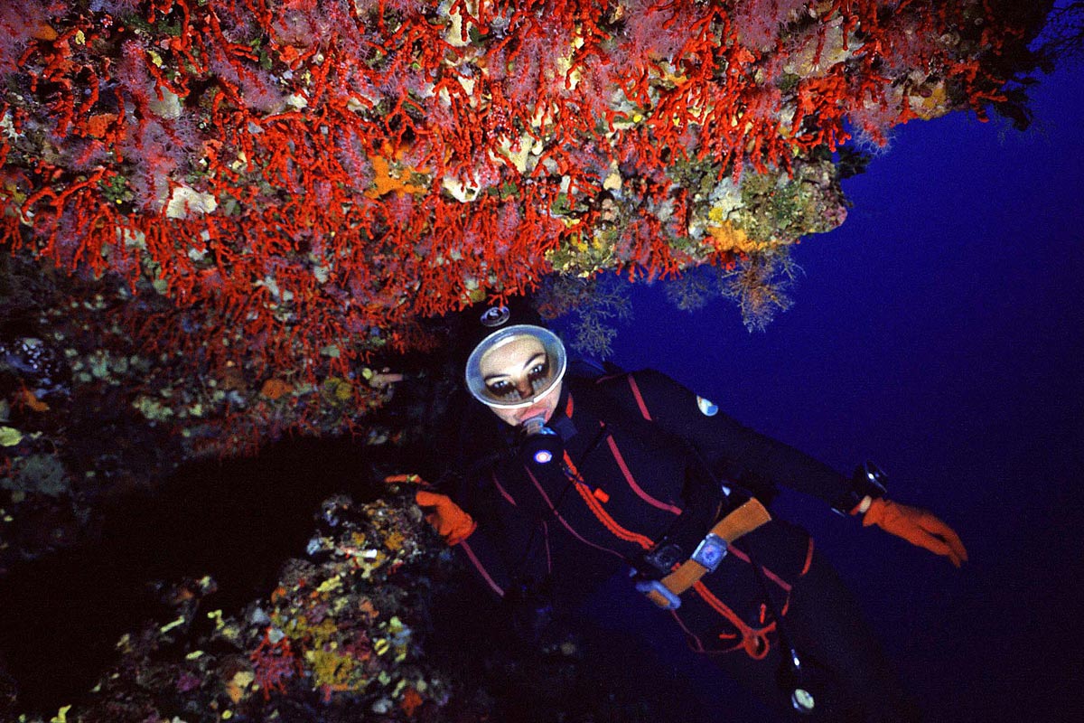 Modella e Corallo rosso, Corallium rubrm – 20 mm. – 1 Flash  - Secche di Capo Fonza – Isola d’Elba – Italia.