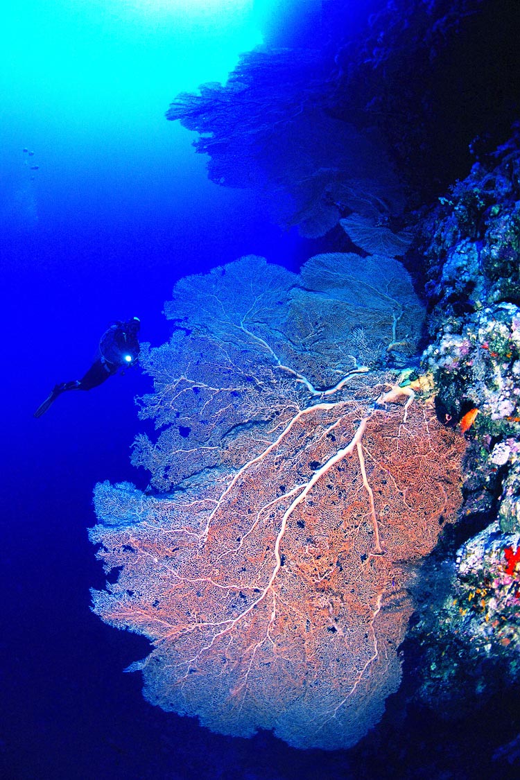 Uno scatto realizzato in profondità nelle acque dell’Arabia Saudita; una immensa parete di gorgonie e un sub leggermente arretrato rispetto al primo piano, crea un effetto prospettico che aumenta visivamente la dimensione della gorgonia e, nel contempo, da l’idea della maestosità di questi stupendi ventagli.