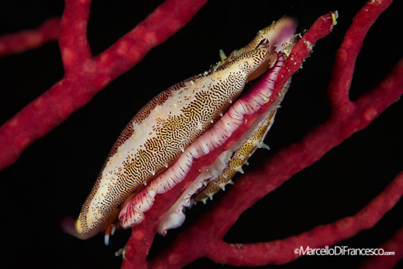 Una Simnia spelta intenta a cibarsi della gorgonia Leptogorgia sarmentosa Numana – Canon 100mm – F18 1/200 iso 200