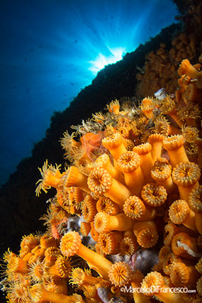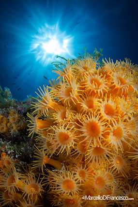 Due esempi di close focus wide angle; Grazie al minidome Nauticam abbinato al tokina fisheye 10-17mm ed a un teleconverter kenko 300pro è stato agevole avvicinarsi alla minima distanza di messa a fuoco consentita ed illuminare il soggetto principale. (una colonia di Parazoanthus axinellae). Portofino – F22 1/200 iso 100