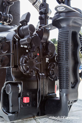 Alcuni particolari che evidenziano l’elevata ergonomia del sistema Nauticam : pulsante di scatto e leva iso, comandi e ghiere di regolazione tempi e diaframmi, tutti controllabili comodamente mantenendo le mani sulle maniglie.