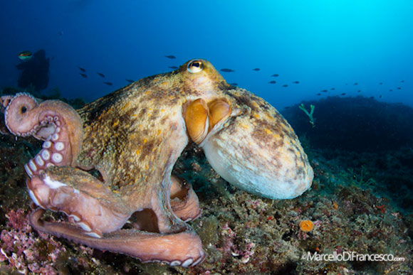 Un polpo di notevoli dimensioni nell’area marina protetta di Portofino – Tokina Fisheye 10-17mm con minidome Nauticam; F11 1/200 iso 200