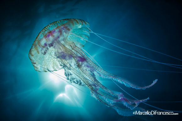 Pelagia noctiluca nelle acque del mar ligure; scatto eseguito a soli 5 metri di profondità nelle prime ore del pomeriggio, condizioni di luce difficili per un controluce che Canon 5dMKIII ha gestito in maniera davvero eccellente.