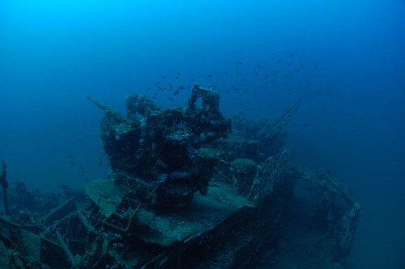Superata la zona della plancia si presenta uno spettacolo mozza fiato, sulla tuga bellissime con le canne puntate ancora verso il cielo le mitragliere binate da 20 mm, che servivano per il fuoco di sbarramento antiaereo, sia a dritta che a sinistra sono ancora in posizione i tubi lancia siluri, inclinati di circa 30° rispetto allo scafo, posizione che indica che la nave era ancora in caccia o comunque ai posti di combattimento, altrimenti com’era usanza delle navi della Regia Marina tutte le armi vengono riposte in posizione di navigazione di trasferimento, ovviamente ormai senza teste in guerra, fatte brillare nel 2004.