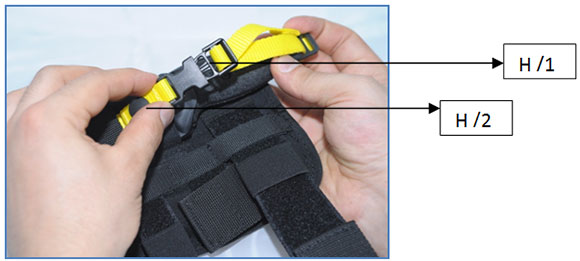 • H/1 Chiusura antipanico: E’ sufficiente tirare energicamente la parte superiore con una presa dal manico, per provocare l’apertura del bottone di emergenza e rendere disponibile il coltello, senza dover agire sullo sgancio regolare anteriore. Questo garantisce, a differenza delle usuali sicure di bloccaggio, la garanzia di poter accedere