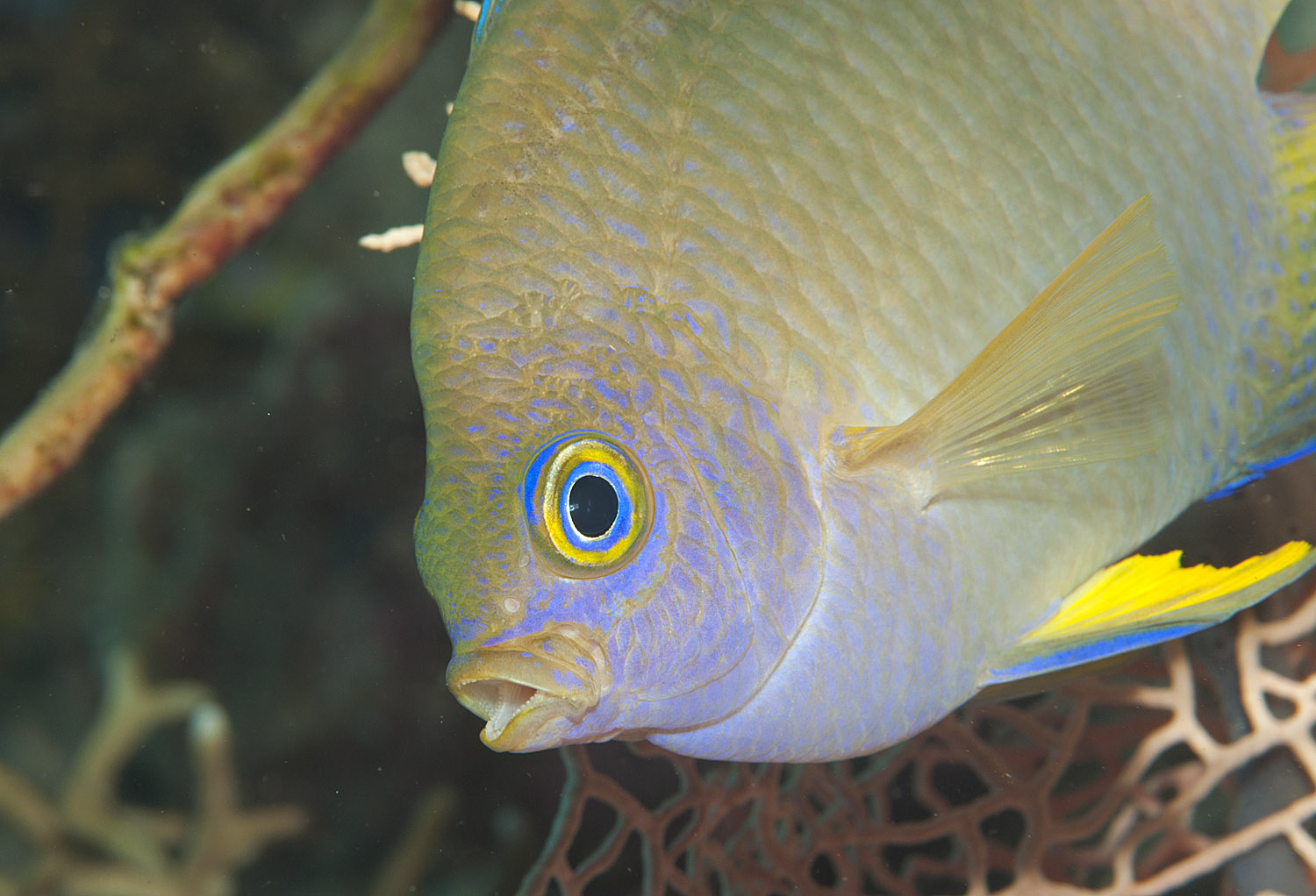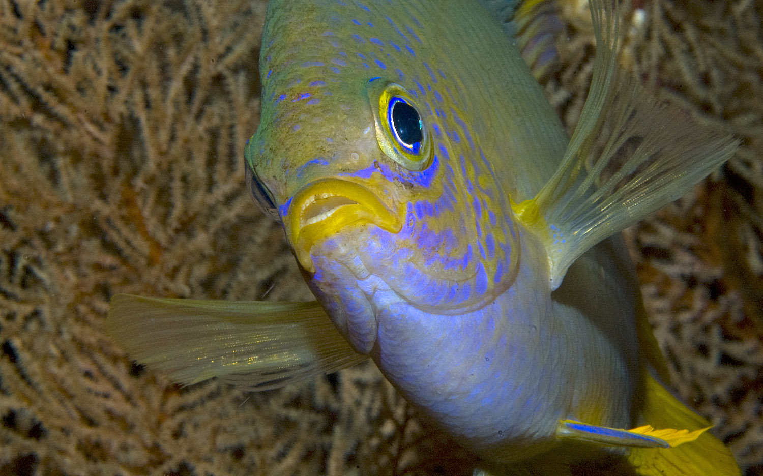 Un dettaglio non da poco: nelle foto illuminate col flash noi vediamo più o meno bene le macchie azzurre sul giallo, in luce ambiente non le vedremmo così bene, ma le damigelle sono sensibili all’ultravioletto, e in acque superficiali limpide vedono il pattern di macchie facciali con grande chiarezza e arricchito di dettagli che noi non possiamo vedere.