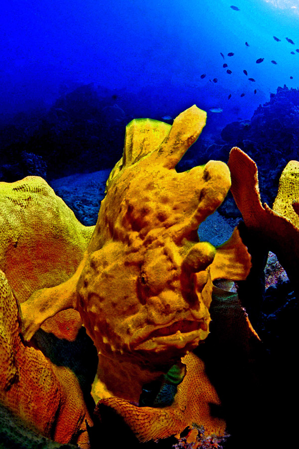 Impiegando specifici oblò correttori dedicati (Minidom), ma anche con un Dom “normale”, si possono effettuare riprese di soggetti di non grandi dimensioni (nel nostro caso Antennarius commersonii della lunghezza di 30 cm.); realizzando quella che, se portata all’estremo, viene definita “macro ambientata”. Quando si va molto vicino al soggetto possono insorgere problemi di illuminazione, nel caso specifico l’antennaride era all’interno di una spugna che, nel caso di posizionamento dei lampeggiatori sui lati della zona di ripresa, avrebbe impedito alla luce di passare. Per ovviare a questo inconveniente è stato impiegato un solo flash, il secondo è stato spento e la luce è stata fatta scendere dall’alto, come fosse la luce del sole.