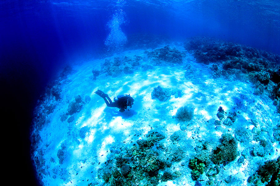 L’orizzonte fotografico subacqueo, anche in acque particolarmente trasparenti, è molto limitato. Utilizzando un Fisheye, come se stessimo fotografando un panorama terrestre e sfruttando quindi la sua capacità di allontanare e ridurre visivamente la dimensione degli sfondi, possiamo dare l’impressione di muoverci in grandi spazi, anche se stiamo operando in un’area abbastanza ristretta.
