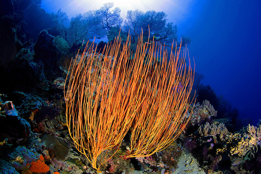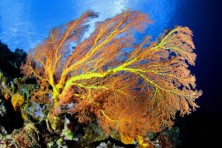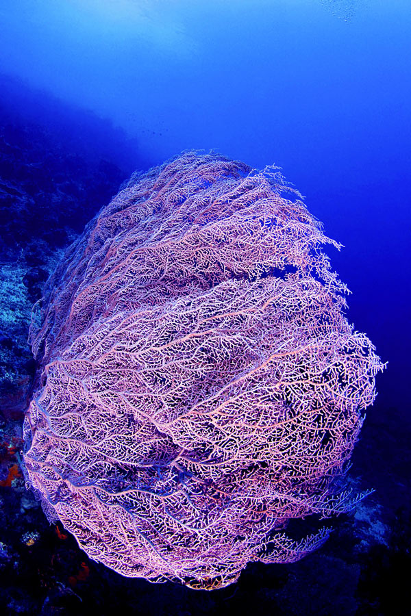 Tra le diverse particolarità dei Fisheye, molto utile nella fotografia subacquea è la capacità di aumentare visivamente le dimensioni dei primi piani, a patto di andare molto vicino al soggetto e, di conseguenza, di allontanare gli sfondi. Le gorgonie in primo piano Elliessella sp. che appaiono, in confronto allo sfondo, di grandi dimensioni; erano invece alte max 50 cm. A parte casi particolari (immagini di relitti interi, la rappresentazione di grandi spazi …), lavorando con ottiche Fisheye è sempre bene stare più vicini possibile al soggetto; in questo modo, oltre ad altri vantaggi, si ridurrà lo spessore di acqua tra soggetto e fotocamera, con notevoli benefici per la limpidezza e la leggibilità dell’immagine.