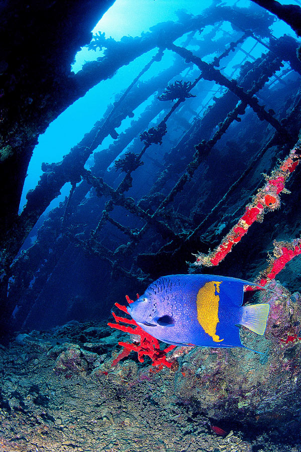 I Fisheye sono particolarmente adatti alle riprese di relitti. Lo scatto è stato effettuato sul relitto dell’Umbria, nelle acque prospicenti Port Sudan. Nel caso specifico è stato illuminato soltanto il pesce e una piccola parte dell’intorno, con l’impiego di un solo flash. Lo sfondo è rimasto a luce ambiente e le linee curve che lo caratterizzano, esaltate dall’uso di un Fisheye, attribuiscono un gradevole effetto di “circolarità” all’immagine. Il Pomacantide in primo piano, elemento portante dell’immagine, diventa il centro di interesse della stessa.