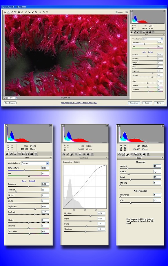 Le regolazioni effettuabili nell’ambito della conversione spaziano poi nella taratura delle alte luci, dei toni medi e scuri, la calibrazione della intensità e della saturazione delle tonalità di colore, la compensazione delle ombre. Seguono un’altra miriade di regolazioni possibili, tutte volte a sfruttare al meglio la quantità di informazioni del sensore, ma molte di queste potranno essere modificate efficacemente anche dopo la conversione.