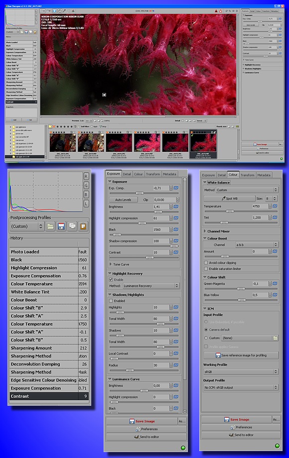 La schermata di "Raw Therapee", freeware, anche qui vediamo moltissime opportunità di regolazione preventiva dell’immagine grezza, unitamente alla registrazione della "storia" delle regolazioni effettuate.