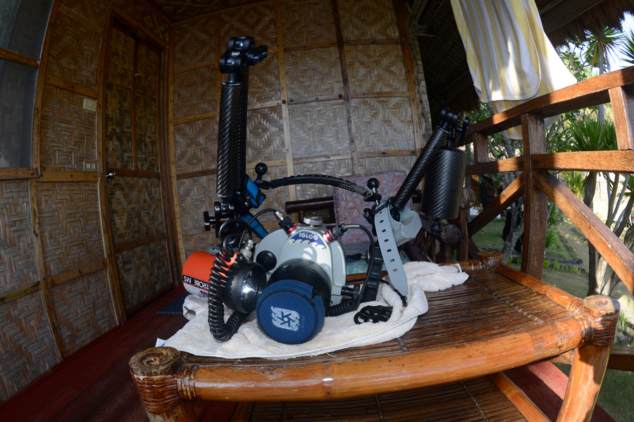 Una volta arrivati nella nostra stanza di hotel o della barca è una buona idea “sequestrare” un angolo per creare una piccola stazione di ricarica batterie, dopo essersi impossessato di quest’angolo con somma gioia della moglie, recuperiamo un tavolino o anche uno spazio a terra usando un asciugamano o una stuoia dove sistemare tutta la nostra attrezzatura fotosub così da vedere se c’è tutto e poter iniziare ad assemblare con calma facendo i dovuti check. Non è detto che quello che funzionava a casa poi funzioni perfettamente una volta arrivati, purtroppo la legge di Murphy è sempre in agguato, meglio scoprire l’inghippo in stanza che al mattino al diving.