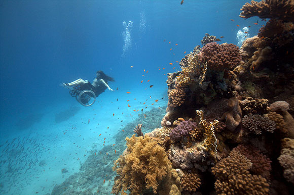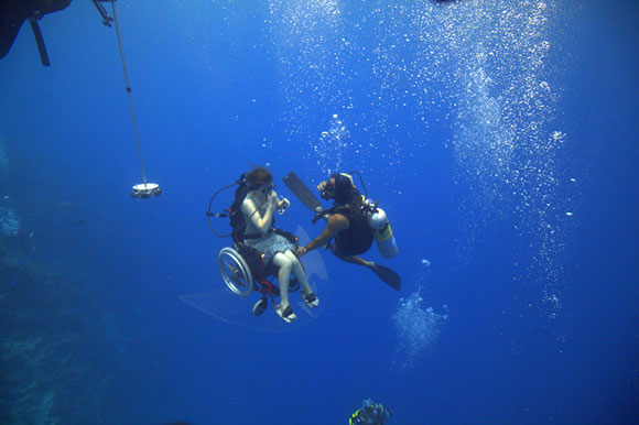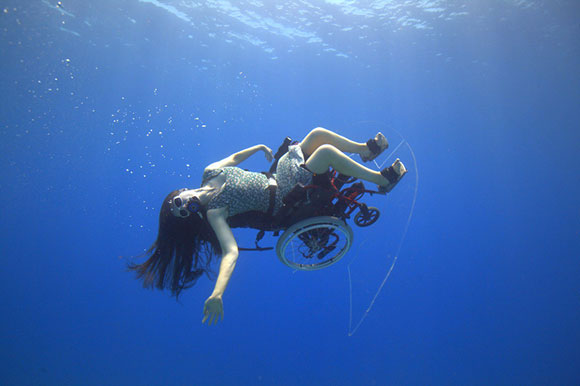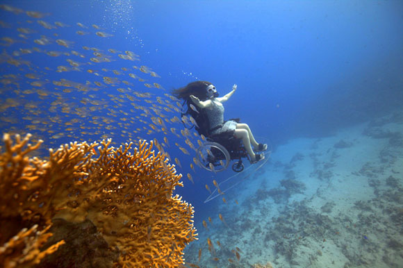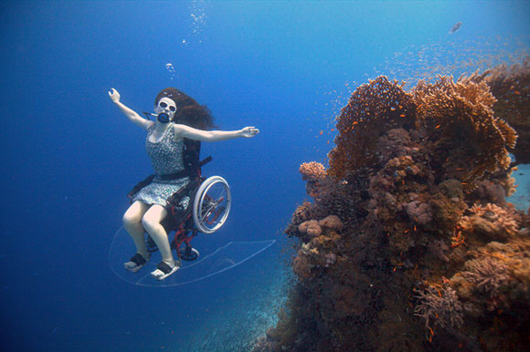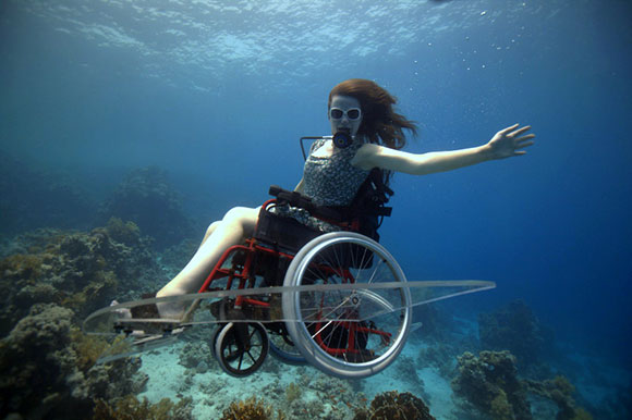 E’ così che nel Dorset, in Inghilterra, il team di Freewheeling trasforma una normale sedia a rotelle in una sedia ad auto propulsione subacquea. E’ così che una sedia a rotelle, da sempre associata a un’idea di limitazione, diventa l’emblema della libertà in un ambiente -quello subacqueo- senza peso, leggero, libero.