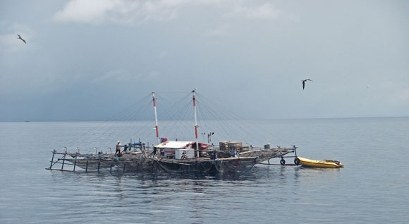 La baia di Cenderawasih, aperta a nord est, riceve per prima le correnti equatoriali ricche di plancton e di pesce che arrivano dal Pacifico, trascinate dagli Alisei. Il pesce di passo, sardine, acciughe e sugarelli, qui si ferma a riposare e a nutrirsi, e durante gli anni ’80 comincia ad attirare l’attenzione di alcune imprese di pesca indonesiane, che decidono di stabilirvi dei bagan, cioè delle stazioni di pesca galleggianti. Sul bagan vivono fissi dei pescatori, di solito provenienti dalle popolazioni Bajau del sud di Sulawesi: uomini di mare, capaci di passare mesi a galleggiare, senza tornare a terra. A sera accendono lampare alimentate da un generatore a gasolio e aspettano che le reti si riempiano per issarle a mano, cariche di acciughe, sardine, sugarelli, che in parte finiranno sui mercati locali e in parte saranno usate come esca per pescare i tonni. Soprattutto i pesci destinati a questa pesca sono mantenuti vivi all’interno di gabbie di rete galleggianti.