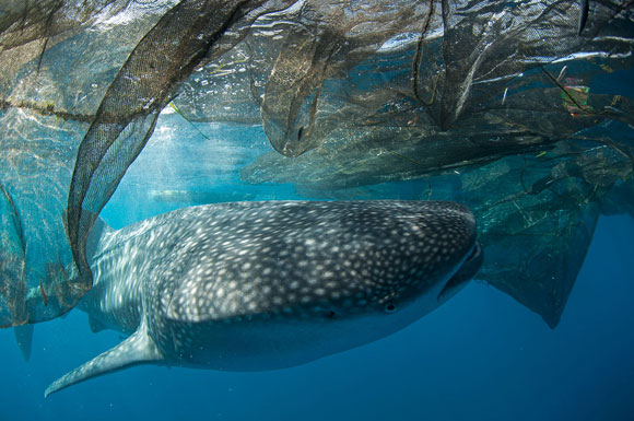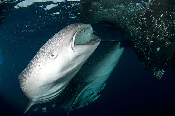 L’abbondante esca viva attira l’attenzione di qualcun altro, qualcuno che ama seguire le correnti oceaniche, trainate dagli alisei, e seguire i banchi di pesciolini minuti di cui si nutre. Lo squalo balena, gigante dalle lentiggini bianche, si trova a entrare nella baia e a nuotare, vicino alla superficie, attorno alle reti, forse chiedendosi perché quella palla di pesce appetitoso ora risulti irraggiungibile.
