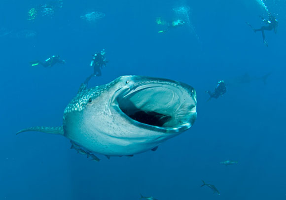 Lo squalo balena può mangiare nuotando a bocca aperta.