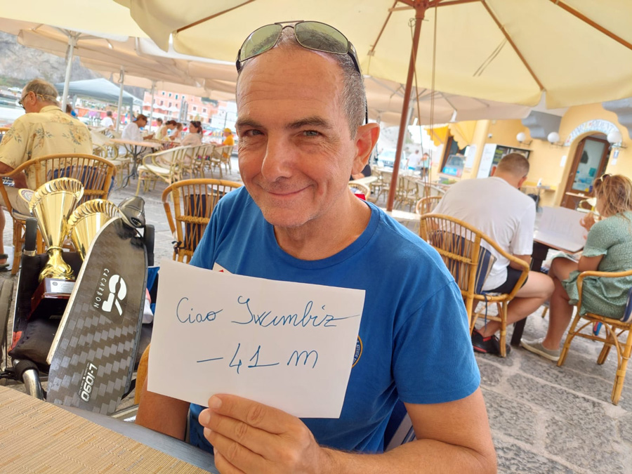 Questo risultato ha ulteriormente arricchito il suo curriculum già ricco di primati, che comprende record mondiali CMAS per Diversamente Abili di Apnea Dinamica senza attrezzi in vasca da 25 metri.
