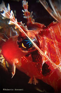 In questo primo piano di Scorpaenopsis oxycephalus si nota bene l’enorme bocca, la cresta e gli apparati termici (Foto Roberto Sozzani).