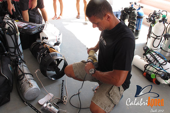 apneista di CalabriApnea che sovrintende alla procedura prevista dalla CMAS per