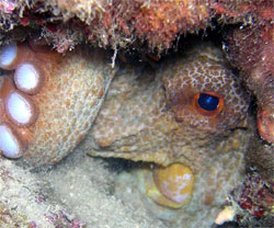 il piccolo polpo marginato (Octopus marginatus), noto anche come polpo dei cocchi, per la sua abitudine di trasformare i gusci di noce di cocco gettati in mare in comode tane;