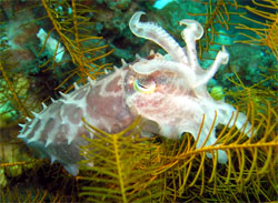fra i polipi espansi di una Xenia può capitare, raramente in realtà, di scorgere con qualche difficoltà la piccolissima Sepia papuanensis, in grado di adattare la sua colorazione al ritmo dell’aprirsi e richiudersi dei polipi fra i quali si nasconde.