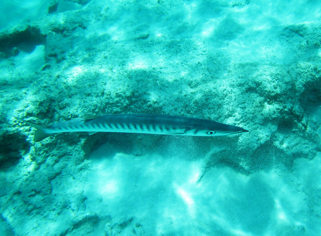 A est dell’isola, nei pressi di Sant’Agostino, la sabbia lascia il posto agli scogli, colonizzati da alghe, spugne e colorate stelle marine. Tra gli anfratti si vedono belle cernie e a mezz’acqua stazionano miriadi di saraghi e occhiate… sembra di essere in un acquario. C’è anche un grosso barracuda che mi passa accanto un paio di volte, a distanza molto ravvicinata. Questo predatore, un tempo era comune lungo le coste africane del Mediterraneo, ma che da qualche anno si è spostato più a nord. Nonostante l’aspetto minaccioso, non è pericoloso per l’uomo.