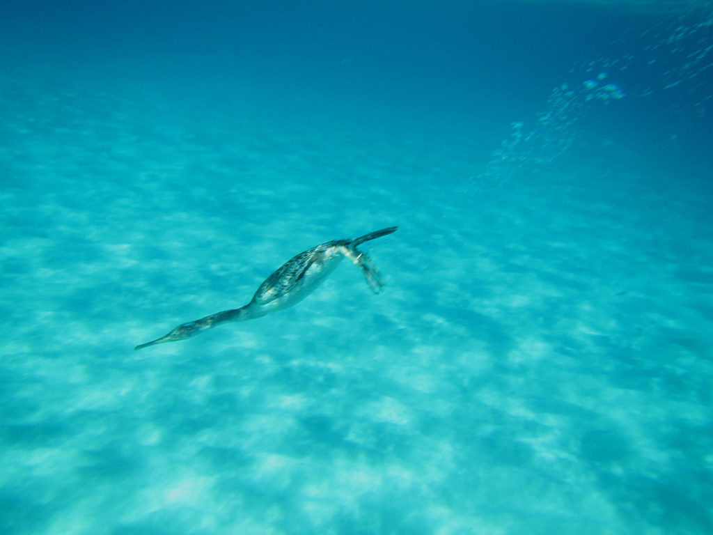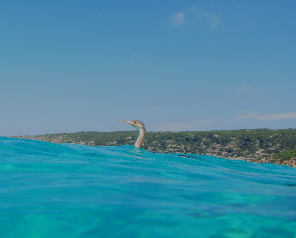 La spiaggia di Ses Illetes, situata a nord-ovest, è una delle più belle e visitate dell’isola. Qui la sabbia è finissima e ha una caratteristica sfumatura rossa prodotta dai gusci del foraminifero Miniacina miniacea. Mentre nuoto in questa splendida laguna delimitata da piccoli isolotti, mi ritrovo a un passo da un cormorano, quasi un faccia a faccia. Superato lo stupore, lo fotografo mentre s’immerge per inseguire un banco di lattarini.