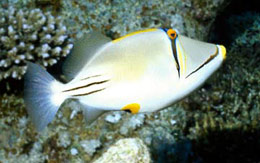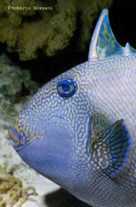 Primo piano di un Balistes fuscus, si nota bene la pinna dorsale rialzata. (Foto Roberto Sozzani) |