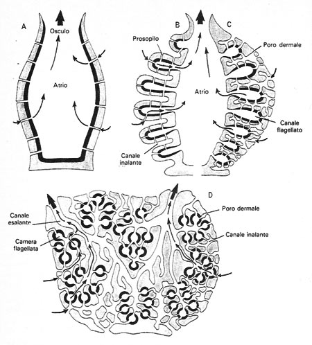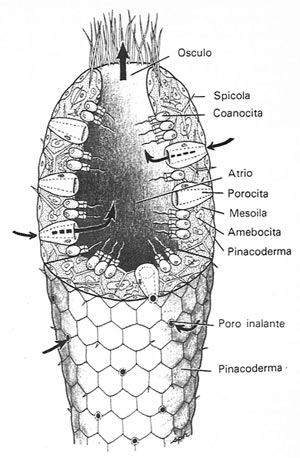 Nei Poriferi si differenziano 3 principali tipi di organizzazioni: ascon, sycon e leucon. Il tipo ascon è contrassegnato da un corpo sacciforme, consistente in una sottile parete (composta da 2 strati epiteliali) che delimita la cavità centrale, detta cavità gastrale (tappezzata da uno strato di coanociti provviste di un flagello contornato, alla base, da un esile colletto trasparente) che si apre nella parte superiore con uno stretto osculo. Il tipo sycon non è molto differente rispetto al primo (una delle poche differenze è data dalla mancanza di coanociti nella cavità gastrale, localizzati, invece, in diverticoli della cavità stessa), mentre il tipo leucon denota una maggiore complessità.