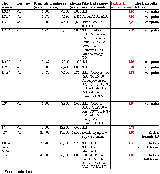 Tanto per dare un minimo di concretezza al discorso, vediamo le dimensioni dei principali sensori in commercio e i loro fattori di moltiplicazione: