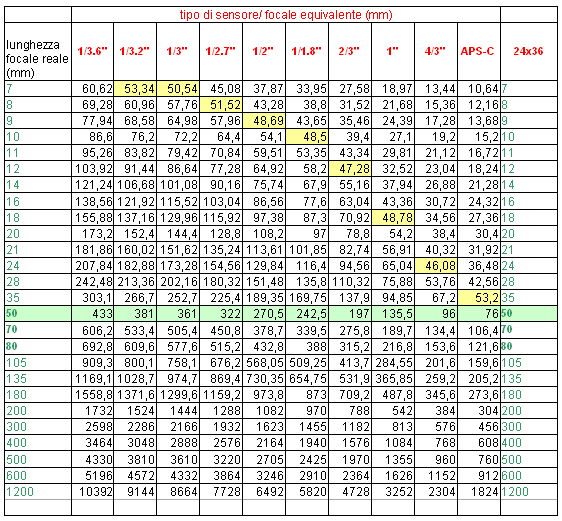Vediamo un’altra tavola: vi sono elencate le lunghezze focali principali rapportate ai diversi formati di sensore. Ad ogni lunghezza focale reale corrispondono diverse lunghezze focali “apparenti��? dovute al fattore di moltiplicazione dei diversi sensori.