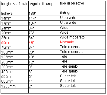 Vediamo adesso una tabella che mette in relazione le lunghezze focali, per un formato 35 mm, con gli angoli di copertura dei diversi obiettivi.
