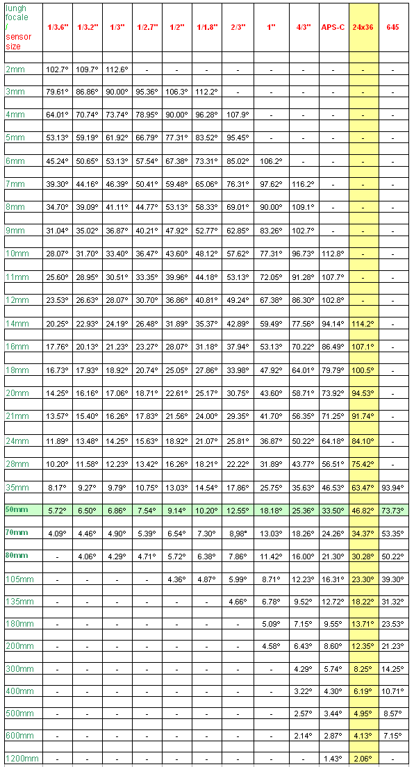 Premessa: l’angolo di campo di un obiettivo dipende sia dalla sua lunghezza focale che dalle dimensioni dell’elemento sensibile.
