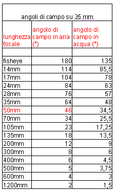 Vediamo un paio di tabelle. La prima riporta gli angoli coperti da diversi obiettivi, su sensore da 35 mm, in aria ed acqua: