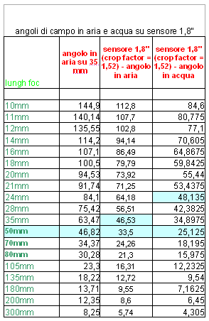 Nella seconda tabella sono riportati gli angoli di copertura delle diverse lunghezze focali, su 35 mm, su un sensore 1,8��? e sullo stesso sensore ma in acqua.