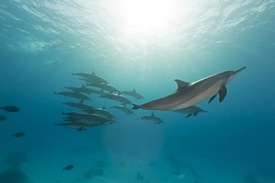 Si salta sul nostro fedele compagno di bisbocce, Medhuma, il dhoni, e si prende il mare per una della più belle pass oceaniche da queste parti: Maarehaa Kandu. Kandu per l’appunto significa pass, ovvero un canale che mette in comunicazione l’oceano aperto con la laguna interna dell’atollo. Imponenti banchi di pesce pelagico quali: tonni, barracuda, carangidi oltre ad una miriade di squali, frequentano di sovente questi ambienti in quanto ricchi di prede e acque ben ossigenate per via della cospicua corrente. Aspettiamo che gli ultimi subacquei saltino dalla barca ed ecco che questa e tutta per noi…gli snorkelisti!!! Ci si butta verso la parte oceanica del canale, giusto un po’ all’interno però dove il mare e meno mosso e la corrente più collaborativa (safty first!). Inizia lo show… Lo snorkeling in pass è suggestivo per diverse ragioni, la prima è che si è portati come su un nastro trasportatore da un flusso d’acqua continuo…tutto passa attorno…tutto scorre… quasi non bisogna pinneggiare ma solo guardare, respirare e rilassarsi. Una seconda ragione è che qui la visibilità è sorprendente, l’acqua è cristallina, si vede il fondo nitido a 30 e più metri. Sembra di essere sospesi nell’etere, si vede la propria ombra sotto di se…e con la corrente che spinge…Beh si sembra di volare! Maarehaa Kandu si caratterizza per avere un reef a dorso d’asino su un lato del canale, tappezzato di coralli duri ed insenature che forniscono un rifugio ideale per decine di tartarughe. Eccole lì, quasi ad aspettarci…una, due cinque dieci tutte insieme! Piano piano si staccano dal fondo ci scambiano un’occhiata e senza fretta si allontano più in là…Appartengono principalmente alla specie Chelonia mydas o tartaruga verde, che sebbene minacciate a livello globale sembrano qui prosperare numerose. Il bagno ha già dato soddisfazioni non indifferenti: tartarughe, aquile di mare, barracuda… ma un orecchio forse un po’ più allenato degli altri, quello del sottoscritto, capta frequenze in mare inconfondibili….Stenelle!!! Tiro fuori la testa dall’acqua e vedo all’orizzonte un branco numeroso di chiassosi cetacei odontoceti, per l’appunto Stenella longirostris, animali simili a piccoli delfini, di un colore grigio metallico, che saltano e sbuffano a qualche centinaio di metri da noi. Decido di provare a nuotare verso di loro consapevole del fatto che le possibilità di vederli sott’acqua sono molto scarse in quanto animali abbastanza timidi che si allontanano velocemente se disturbati. Lascio il reef con il gruppo e ci portiamo ad una distanza tale da poterli osservare con la testa fuori dall’acqua. Questi mammiferi marini sono in grado di compiere evoluzioni fenomenali: salti mortali, avvitamenti, piroette…Degli acrobati nati…non si sa bene cosa sia dovuto questo comportamento ma probabilmente può trattarsi di semplice gioco. Già estasiati dal circo che ci si para davanti ci troviamo nel blu totale senza più un reef di riferimento. Poco male. Chiamo il dhoni e si risale a bordo. La gioia è collettiva è siamo tutti contenti per l’incontro fortuito, seppur goduto da lontano…I miei occhi però sono ancora fissi sul gruppo di stenelle che saltano all’orizzonte…realizzo che il branco nel suo insieme è numerosissimo e fa direzione nel centro della pass… chiedo al capitano di provare ad avvicinarsi e vedere cosa succede. Al nostro arrivo, come di consueto, gli animali si apprestano nei dintorni della barca ed iniziano a giocare con le onde da noi generate, a poppa e a prua. Sono ovunque, forse un centinaio o più, tutti vicini tra loro e al dhoni. La tentazione è incontrollabile….La tento….”- Dai ragazzi maschera e pinne presto! In acqua!” Ci si tuffa in movimento, sembra di essere in un film Western quando dei banditi si lanciano da un treno in corsa! Bam! In acqua… Non credo ai miei occhi, che già dall’emozione lasciano scappare un paio di lacrime nella maschera (si sono un sentimentale!). Spettacolo puro, senza parole, unico e raro. Di fronte a noi ci passano davanti una scuola di almeno 50 esemplari più altri più in basso e ai lati. Sono a soli pochi metri da noi e i loro corpi risaltano sul fondo sabbioso bianco come neve. Non sembrano badare alla nostra presenza in acqua e anzi alcuni di loro ruotano il capo per guardarci incuriositi. Uno sguardo umano, profondo ed espressivo che rivela la loro grande intelligenza. Alcuni di loro vengo addirittura colti dai nostri occhi attoniti in atteggiamenti vietati ai minori…decisamente non sono infastiditi! Ok io sono in aria. Delirio! Inizio a farfugliare cose a caso che danno come risultato un abbraccio collettivo tra noi testimoni della scena. Risaliamo a bordo. Ci stringiamo mani, abbracci, ci complimentiamo a vicenda come se fossimo astronauti atterrati al campo base. Non riesco a stare fermo….ho ancora il cuore in gola!