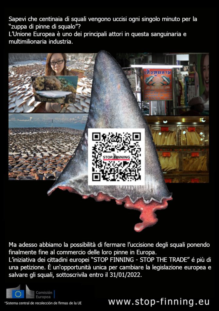 50 giorni prima della fine della votazione, l’Iniziativa dei Cittadini dell’UE sensibilizzerà sul ruolo dell’UE nel commercio di pinne di squalo in molte grandi città europee (Berlino, Parigi, Roma, Lisbona, Barcellona, Dublino, Atene e molte altre). Luoghi e date delle manifestazioni in territorio italiano sono qui.