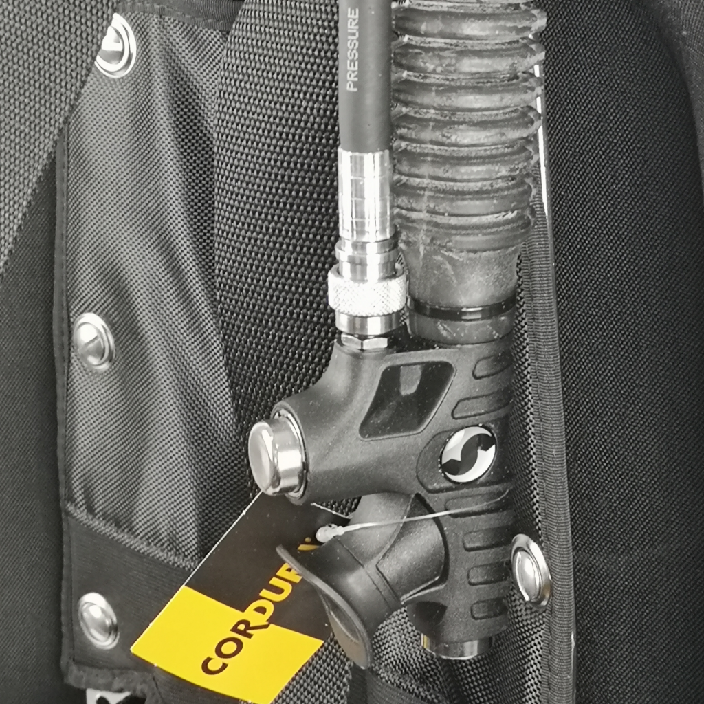 Il corrugato rimane corto sulla spalla sinistra e il VIS Command Inflator ha il pistone ed i pulsanti di carico e scarico in ottone (nelle versioni più economiche i pulsanti IN e OUT possono essere di plastica).