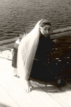 Leda ha organizzato tutto in modo eccellente con la sua creatività che la contraddistingue, e svolto la nostra cerimonia non ufficiale con una serie di cartelli plastificati che abbiamo letto e a cui abbiamo risposto con il classico ‘okey’ subacqueo fino allo scambio degli erogatori in segno di fiducia, degli anelli in segno di amore e del bacio in segno di felicità, mentre i testimoni sub incrociavano le pinne per noi. Dall’alto una pioggia di riso, lanciato da amici e parenti non subacquei rimasti in superficie ad osservare incuriositi e forse anche un po’ perplessi ma partecipi della nostra gioia. Cristian ci ha seguiti sott’acqua e ha fotografato ogni momento in modo che anche chi non c’era possa vedere cos’è accaduto in quei momenti nelle acque milanesi in cui siamo nati e cresciuti e in questa giornata abbiamo scritto un’altra bella pagina della nostra vita.