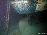Due sono i modi per trovarlo, la discesa lungo una catena che parte quasi dalla riva ed è stesa lungo il declivio del fondale, oppure una discesa in verticale lungo una cima che “cade” vicino alla prua dello scafo, per poter fruire della seconda soluzione però bisogna farsi una nuotata in superficie fino ad una boa di colore blu che dalla riva si nota appena; noi optiamo per questa seconda alternativa poiché scendendo lungo il fondale rischieremmo di alzare un po’ di sospensione a causa del sedimento molto leggero che lo compone, con il risultato che poi ci cadrebbe con tutta probabilità proprio sul relitto rovinando così la possibilità di fare qualche scatto….