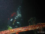 Visto che mi sono portato dietro anche un monobombola da 10 litri agganciato ad un fianco approfitto per fare qualche esercizio del tipo “togli e metti”, “ci passo o non ci passo”, in previsione di una spedizione su un relitto parecchio più profondo ed impegnativo. Dopo una cinquantina di minuti, deco compresa, ritroviamo la superficie, il buio ci avvolge e dal Lago possiamo vedere lo spettacolo offerto dalle luci del paese che si riflettono sulla sua riva, verso la quale ci aspetta una bella nuotata. Insomma, ho voluto descrivere a tutti una delle tante cose che si possono trovare anche sul fondo di un Lago, raggiungibile dalla riva ed alla portata quasi di tutti, una sola raccomandazione: se ci andate rispettate il vecchio Delsy come già lo rispettiamo tutti noi, non sarà ricoperto di coralli ma è pur sempre un patrimonio subacqueo, dove tanti istruttori possono portare gli allievi dei corsi avanzati o molti sub possono andare a divertirsi ed allenarsi senza dover aspettare le vacanze o che qualcuno li accompagni con una barca.