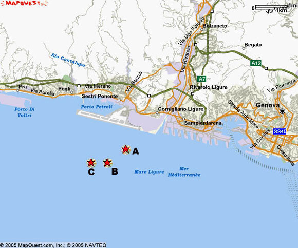 Per fortuna la profondità è minore,circa 70/80 m e questo compensa la sospensione sempre presente, dovuta anche alla relativa vicinanza alla costa e alla foce del torrente Polcevera.