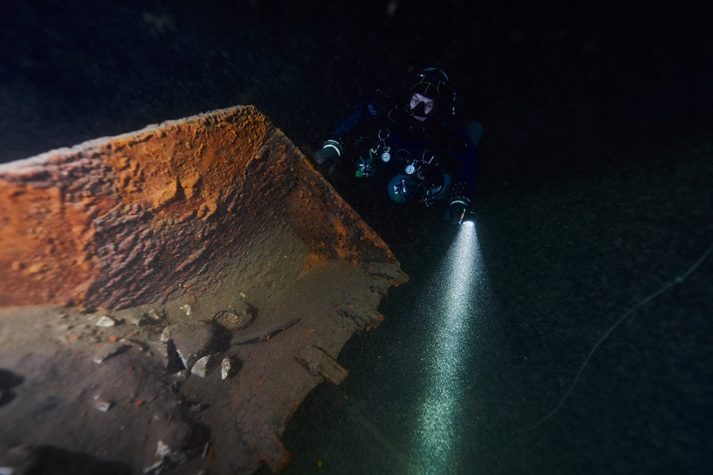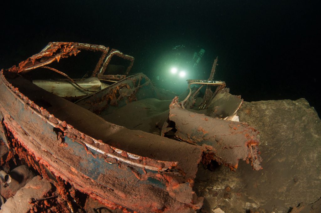 L’acqua già dai primi metri si presenta torbida e opaca. Peccato, però non è fredda. A 18 metri c’è solo nero e fango non vedo nemmeno la mia mano. Proseguo con lo scoter seguendo la sagoma di Andrea. Trenta metri, il nulla. Scivolo ancora più verso i 40. Nulla, mi fermo. Ho perso le luci dei compagni. Proseguo lentamente scendendo trasversalmente sperando di ritrovarli.