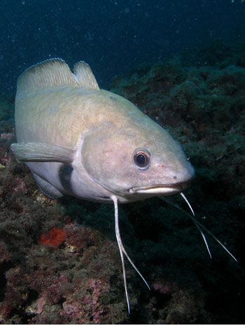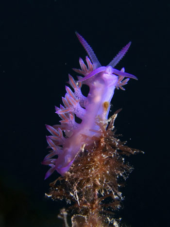 Eccoci all’imboccatura dalla quale fuoriesce la sorgente, avvicinandoci abbiamo una strana sensazione di visione sfuocata dovuta alla diversa densità dell’acqua dolce che si miscela con quella salata. L’apertura è abitata da numerosissime Flabelline rosa e Cratena peregrina probabilmente poichè la struttura è colonizzata da idroidi, briozoi e spugne di cui si cibano questi minuscoli animali. Qui una volta era collegato il tubo flessibile che convogliava l’acqua fino in superficie. Sulla base alla quale sono collegati i tiranti che tengono ancorata la struttura al fondale, si incontano invece numerosi esemplari di un altra specie di nudibranco, l’elegante Dondice banyulensis. Una volta al posto della struttura c’era una grande spaccatura nella roccia dalla quale sgorgava un notevole flusso d’acqua dolce proveniente dalla caverna sottomarina. E’ il momento di risalire a dalla struttura ci dirigiamo verso la cima dell’ancora per terminare quest’immersione speciale. Una delle ragioni che hanno reso importante l’istituzione di un’Area Marina Protetta in questa zona è anche l’esistenza di queste sorgenti che rendono unico questo tratto di mare della Liguria di Ponente.