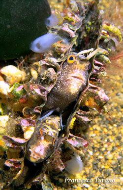 La cura del nido e delle uova dura all’incirca una o due settimane, al termine delle quali nascono larve di circa 4 millimetri. Lo sviluppo del pesciolino è piuttosto rapido e quando raggiunge i due centimetri si nota già l’inconfondibile pinna del dorso. Mi è capitato di vedere esemplari di ogni dimensione in natura, ma mai abbastanza piccoli per analizzarne i caratteri in quella fase. Ho anche assistito ad azioni di caccia da parte di questa specie, svoltesi soprattutto durante le ore notturne. Vermi, piccoli crostacei e qualche pesciolino sono vittima delle sue passeggiate nel buio; e anche di notte eccomi ad intromettermi nel normale svolgimento dei ritmi della natura e a fendere l’oscurità con un bel fascio di luce accecante, che disturba non poco la bavosa. Irrequieta e nervosa, cerca di scappare per sfuggire alla luce, ma io la inseguo e fotografo, scatto e riscatto, aggiungendo luce su luce, questa volta lampeggiante e più intensa. Mi son sempre chiesto quanto incide l’azione di un fotografo in natura, quando invade un territorio, un angolo di mondo sommerso, dove ogni cosa si svolge in armonia secondo leggi precise, dove di notte tutto è silenzio, è quiete. Almeno in apparenza.
