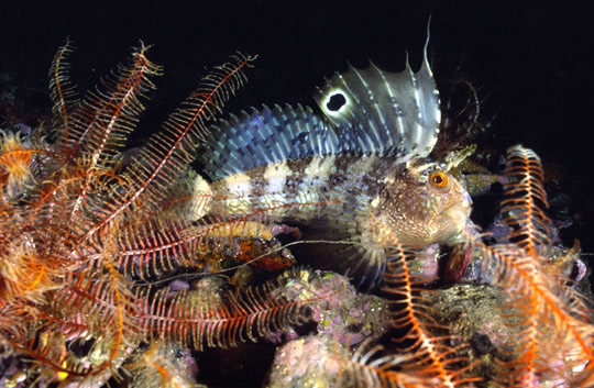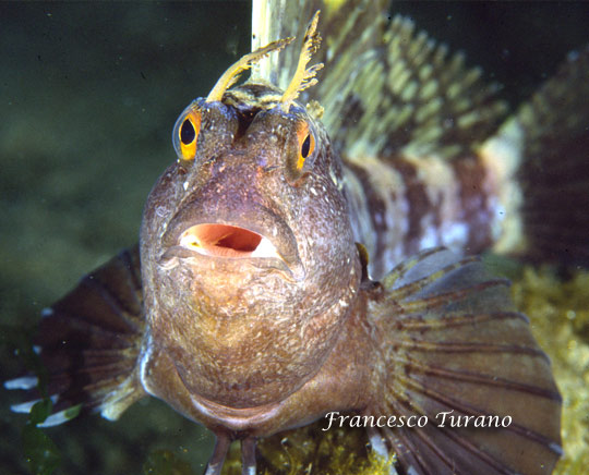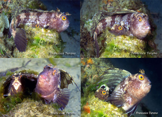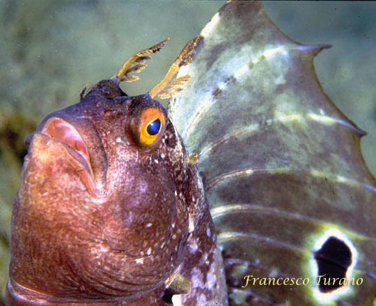 Per apparire più grande e temibile la bavosa sventola la sua enorme pinna sollevandola, mettendo in evidenza la macchia ocellate e ingannando il nemico o il probabile predatore. Così fa anche col subacqueo curioso e invadente, quale devo essere io quando, nelle vicinanze di un nido, mi soffermo molti minuti e scatto molte fotografie, aspettando i momenti migliori per cogliere la coppia negli atteggiamenti più intimi o il maschio sospeso nel blu durante le sue acrobazie a pinne tese. Ho dedicato intere immersioni all’osservazione di questi blennidi particolarmente intriganti. Lo sguardo cattivo di quegli occhi arancioni, sovrastati da pallide corna ramificate, le tondeggianti guance maculate, con quella grande e muscolosa bocca, sempre pronta a mordere quel che capita a tiro, mi hanno stregato e turbato sin dal primo momento, tanto che ancora oggi, quando incontro la bavosa occhiuta, mi soffermo molto e, quando posso, rompo le scatole al punto da farle aprire la pinna dorsale ed assistere almeno a una sintetica serie di evoluzioni, tanto per gradire…