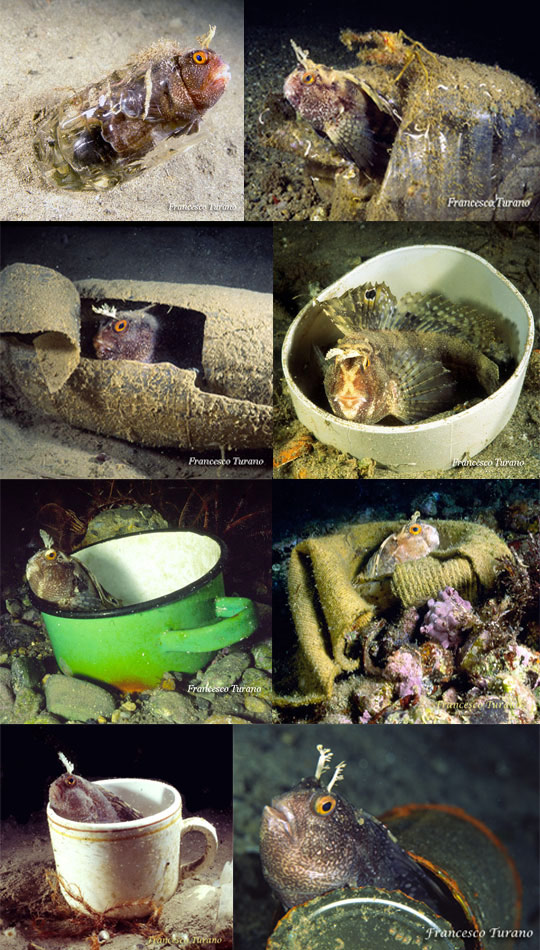 Ho visto quasi sempre la bavosa occhiuta ben nascosta in rifugi di ogni tipo, a tutte le profondità. Potrei stilare un elenco di tane tutte diverse, soddisfacenti per un pesce stranissimo e dallo sguardo minaccioso, con l’occhio vigile che ti osserva dall’interno della sua abitazione. Barattoli di vetro, lattine di pelati, stracci aggrovigliati, pentole, tubi, bottiglie di vetro o plastica semidistrutte, bicchieri, boccali di birra, conchiglie vuote e altro ancora sono tra gli oggetti che per fattura e dimensione sono adeguati alle esigenze di un pesce introverso e scontroso, regolarmente aggressivo e anche molto coraggioso, territoriale da morire, specie nel periodo della cova delle uova, momento che vede il maschio particolarmente impegnato e sempre presente con o senza la sua compagna. Ho avuto la fortuna di assistere più di una volta alla cova delle uova e alle cure parentali di questa interessantissima specie. La scelta del nido, dalle osservazioni in natura e dai documenti raccolti su pellicola, credo proprio sia ben ponderata: ogni volta ho visto nidi che nascondevano quasi completamente le uova e che nello stesso tempo offrivano una certa protezione fisica alla femmina.