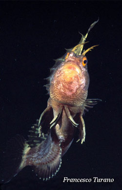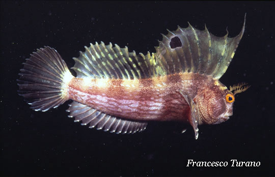 Fatto sta che i miei incontri ripetuti con Blennius ocellaris, la seconda bavosa della famiglia per dimensione dopo il Blennius gattorugine, dovevano necessariamente essere esposti ai subacquei, ai quali la bavosa non solo è poco nota ma, in alcuni casi, addirittura sconosciuta. Gli schemi di una redazione dove, a parte Angelo, erano in pochi a capire qualcosa di mare, mi imposero di dover passare a lui i miei testi, in quanto biologo ufficiale; le mie descrizioni venivano puntualmente filtrate, aggiungendo qualcosa e parlando di esperienze che, in fondo, ero stato io a vivere. Anche per la bavosa occhiuta accadde questa cosa e ne uscì un breve articolo di due pagine, appena sufficiente a illustrare un pizzico di novità su questo pesce la cui biologia è praticamente ignota e del cui comportamento in natura si sa molto poco. Ma più di due pagine non si poterono spedere: il blennide non aveva l’erogatore di marca da mostrare in copertina o la muta ultimo grido da proporre ai lettori…